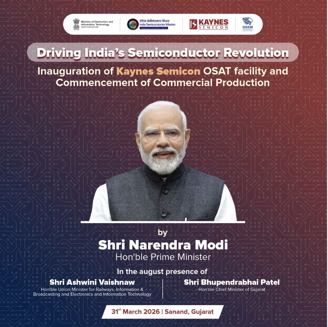 SANAND, GUJARAT 24/3/2026 — In a move set to redefine India’s standing in the global high-tech landscape, Prime Minister Narendra Modi along with Gujarat CM and Union Ministers will travel to Sanand on March 31, 2026, to officially open Kaynes Semicon’s premier semiconductor backend facility.